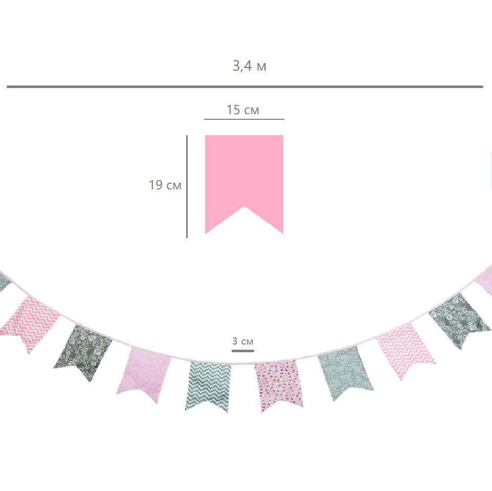 Гирлянда состоит из 12 флажков, общая длина составляет 3,4 м, расстояние между флажками 3 см, длина матерчатых флажков 2,1 м, длина лямок с обеих сторон по 50 см