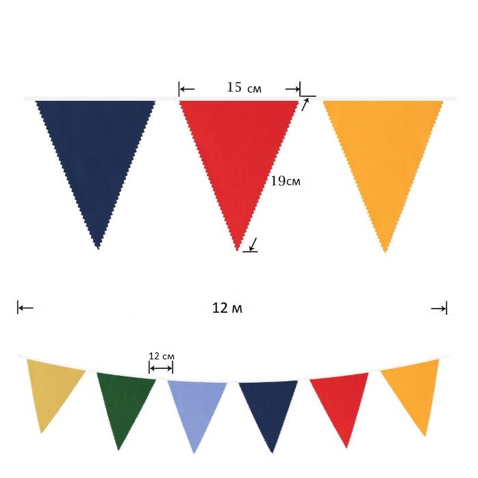 Гирлянда состоит из 42 флажков, из них длина вымпела 9 м, а длина лямок с обеих сторон 45-50 см