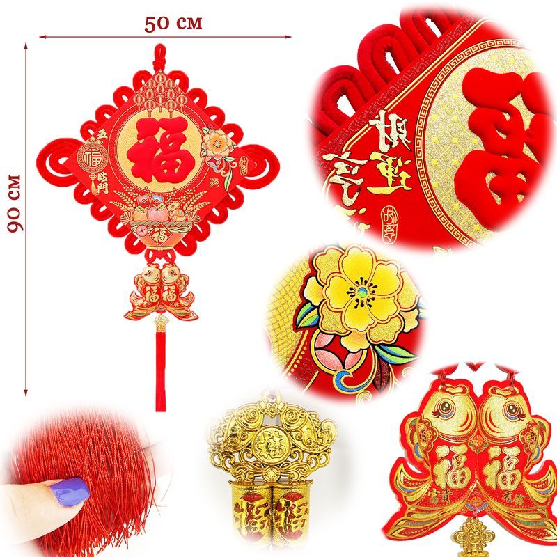 Традиционный китайский узел в форме ромба с символичным дизайном. Яркое сочетание красного бархата и золотых элементов создает эффектный акцент в интерьере.