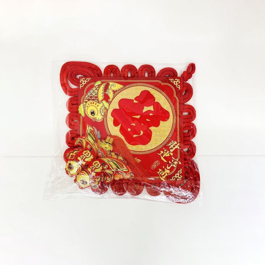 Традиционный китайский узел в форме ромба с символичным дизайном. Яркое сочетание красного бархата и золотых элементов создает эффектный акцент в интерьере.