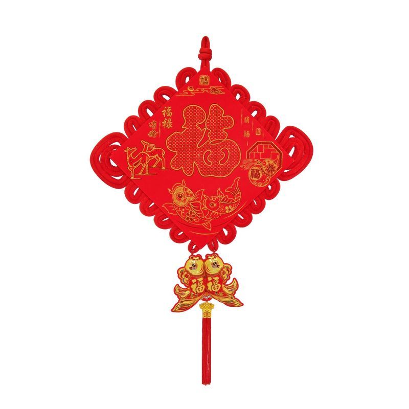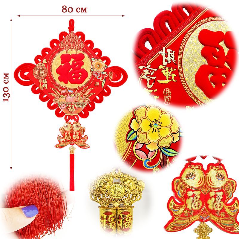 Традиционный китайский узел в форме ромба с символичным дизайном. Яркое сочетание красного бархата и золотых элементов создает эффектный акцент в интерьере.