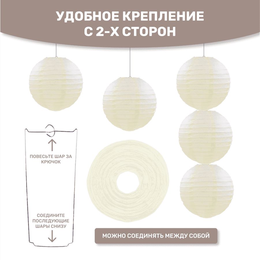 В комплект входит 8 бумажных фонариков и лента атласная.