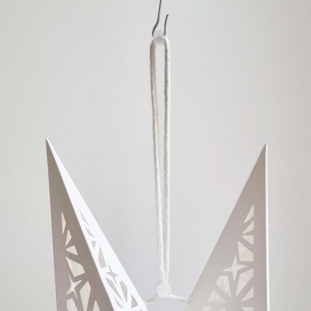 Имеет 9 лучей и встроенный шнурок для подвеса. Доставляется в сложенном виде, легко приводится в рабочее состояние. Для сборки предусмотрен шнурок, который при затягивании формирует объемную фигуру и надежно фиксирует ее форму. После сборки изделие сохраняет стабильную конструкцию без дополнительных креплений, можно использовать неоднократно.