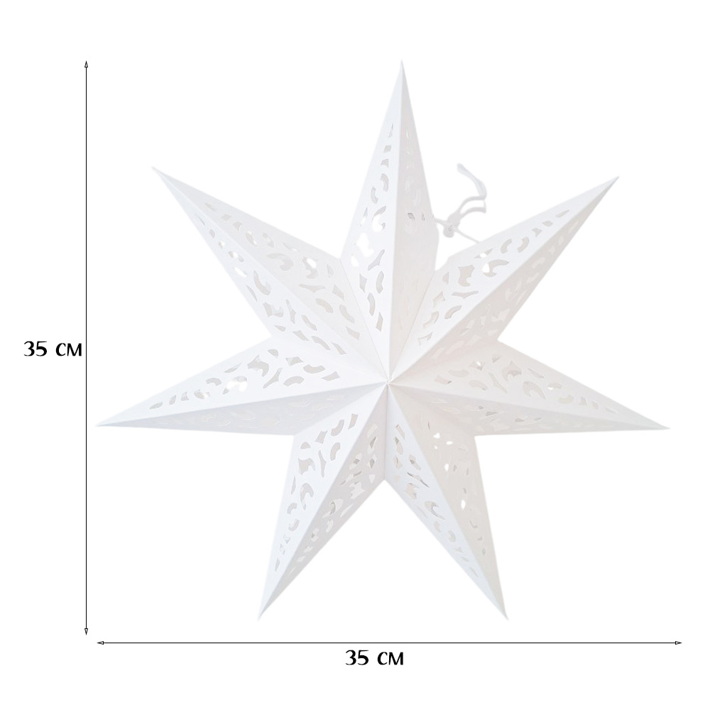 Семиконечная объемная звезда 35 см — великолепный декор из тонкого перфорированного картона. Создает красивые световые эффекты. Поставляется в сложенном виде, в комплекте шнур для фиксации объема и подвеса.