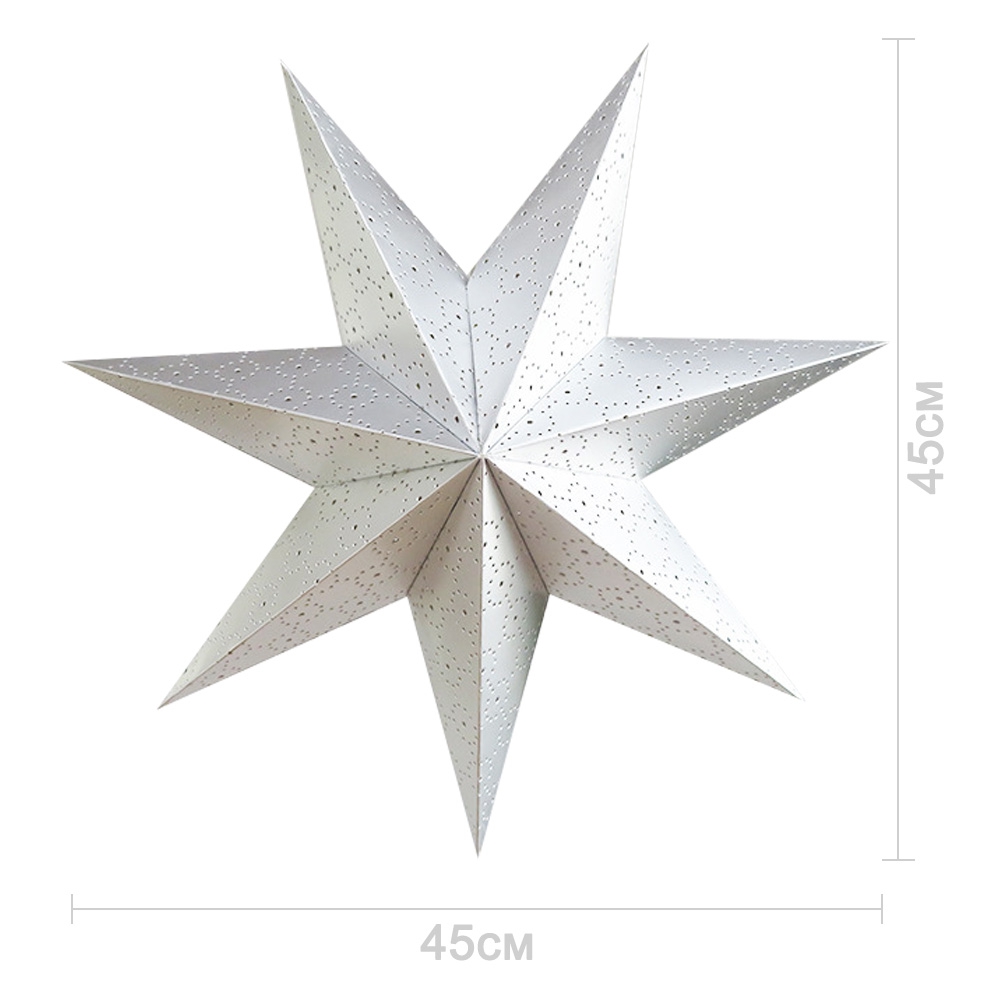 Семиконечная объемная звезда 45 см — великолепный декор из тонкого перфорированного картона. Создает красивые световые эффекты. Поставляется в сложенном виде, в комплекте шнур для фиксации объема и подвеса.