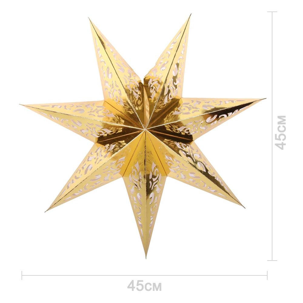 Семиконечная объемная звезда 45 см — великолепный декор из тонкого перфорированного картона. Создает красивые световые эффекты. Поставляется в сложенном виде, в комплекте шнур для фиксации объема и подвеса.
